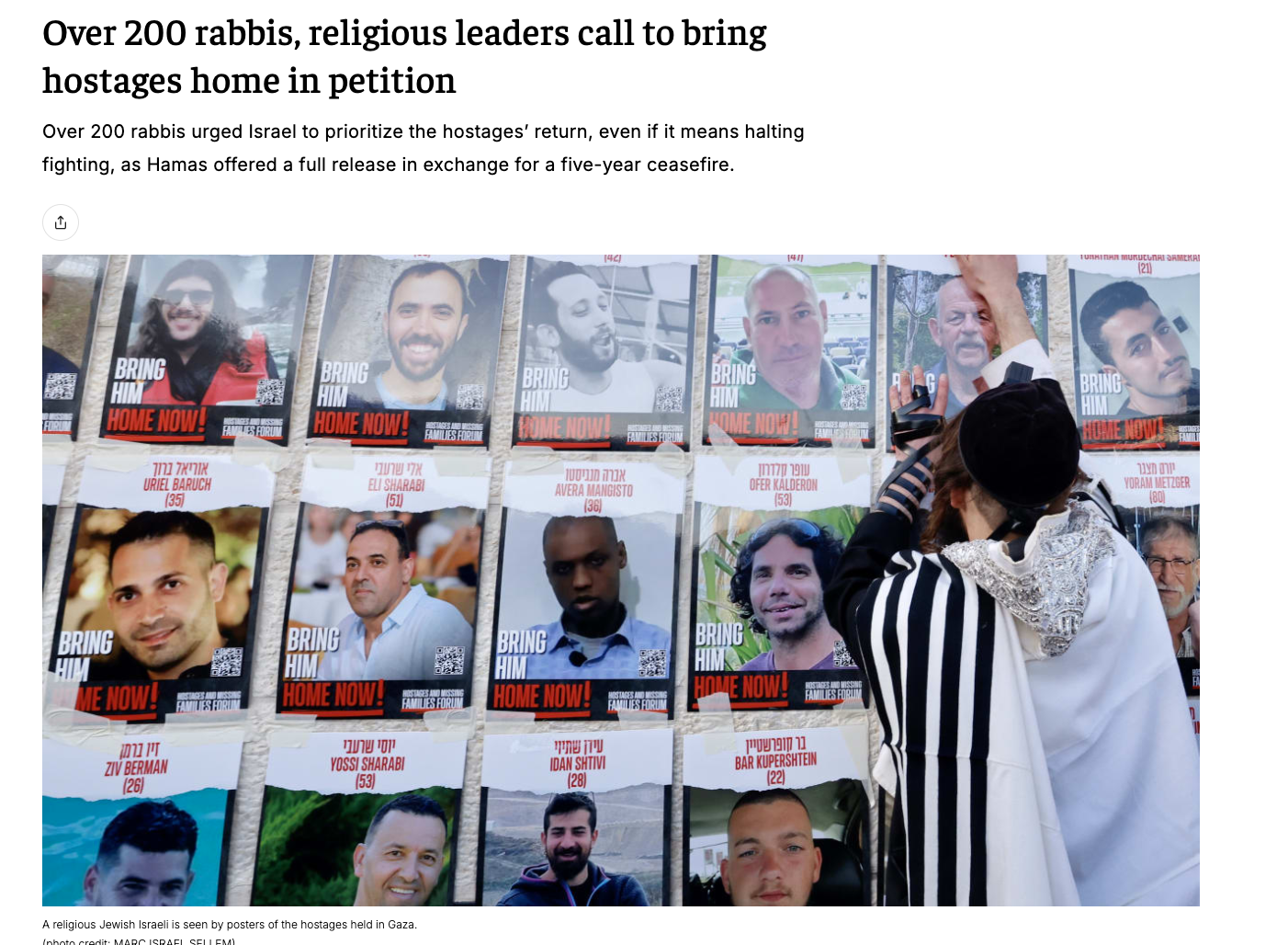 Over 200 rabbis urged Israel to prioritize the hostages’ return, even if it means halting fighting, as Hamas offered a full release in exchange for a five-year ceasefire.